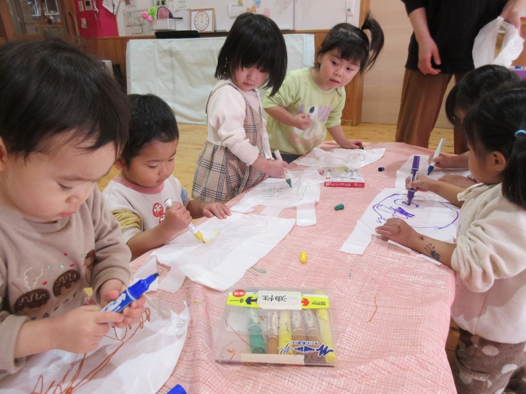 マジックでお絵描きをして、シールを貼って、