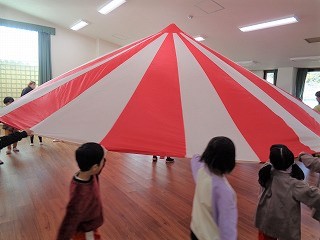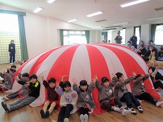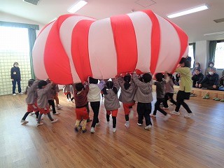 その後は、パラバルーンの披露をしました。子ども達はパラバルーンが大好きで、楽しみながら表現をしていました。