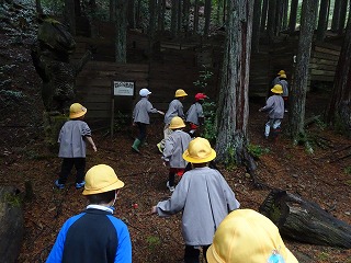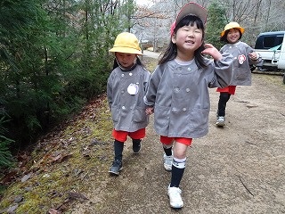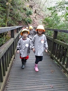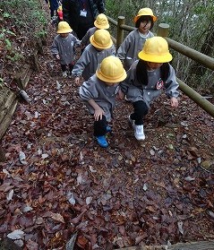 お弁当を食べた後は、ゆり組ばら組は軽登山に行きました。「高い~」「こわい~」と言いながらもどんどん進む子ども達。山の中の自然いっぱいの道を散策出来ました。