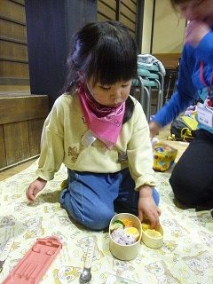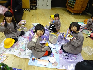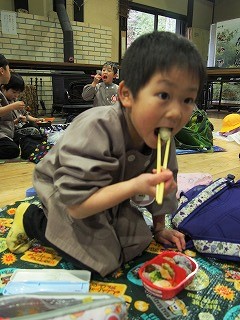 沢山遊んだ後は、待ちに待ったお弁当です♪お家の人からの愛情たっぷりのお弁当はあっという間にペロリ!美味しかったね♪