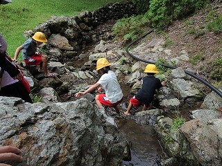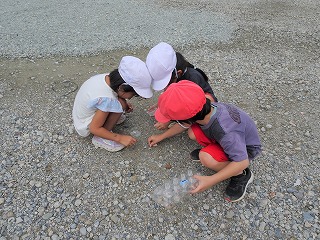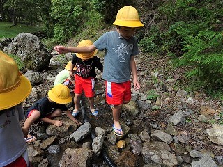 川に入って、上流まで行ったり、水の冷たさを感じたり、生き物を見つけたり・・・。そしてお気に入りの石をさがしたり・・・。自然に触れて沢山遊びました。