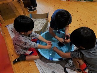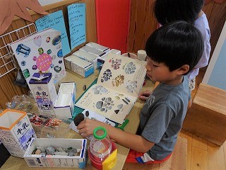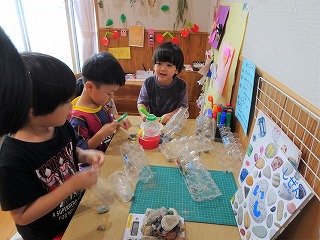 園庭で遊んでいたある日のこと。子ども達が「先生、宝石見つけた!」と嬉しそうに、それぞれ拾った石を見せてくれました。そこから、石探しが始まり、園庭へ出るたびに、石を探す子ども達。探した石を削ったり、色を塗ったり、重さを測ったりとし始めました。