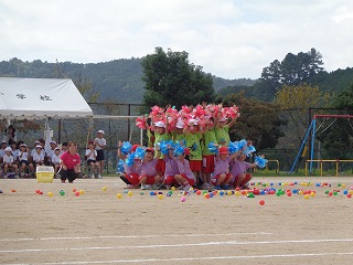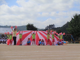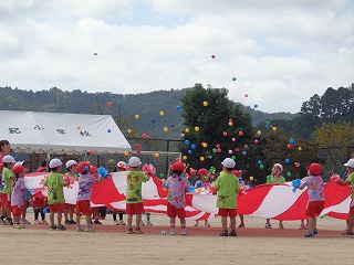 まだかまだかと子ども達も意気込んでいた、4,5歳児のパラバルーン。大運動会当日は、みんなの息もピッタリでした。今年度は、多紀小学校創立10周年です。子ども達から「10周年おめでとう~!」の言葉を伝えると、小学生からも「おめでとう~!」と言葉をかえしてくれ、会場が一体となった瞬間でした♪