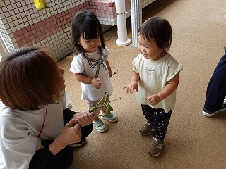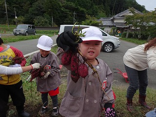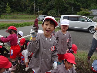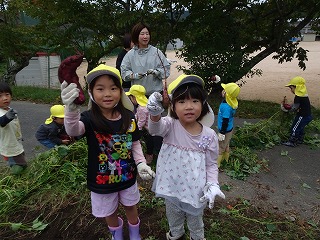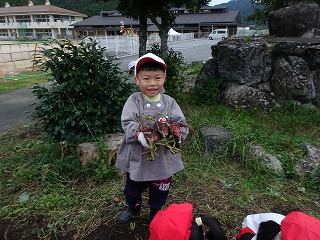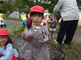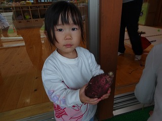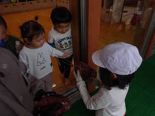 5歳児は収穫後、りす組さんのお部屋までサツマイモを持って行き、小さいお友達に見せてくれていました。
