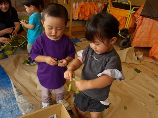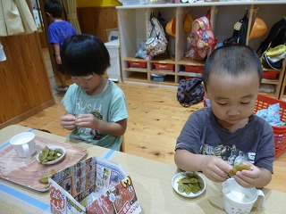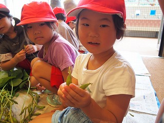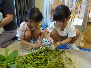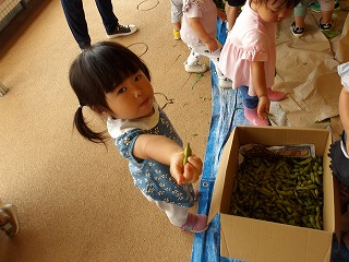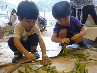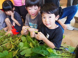 さすが丹波篠山っ子!4,5歳児はお家でもしていると、慣れた手つきで枝豆の収穫をしていました。大きく膨らんだ豆を選び、収穫を楽しみました♪