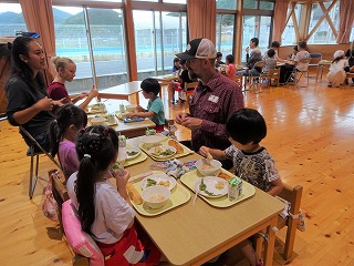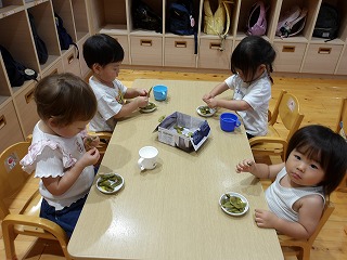 0~3歳児は、おやつの時間に。4~5歳児は、ワラワラの交換留学生と一緒に給食の時間に食べたよ。みんな沢山おかわりをしていました。