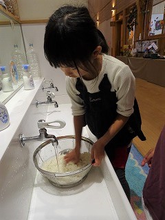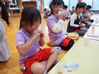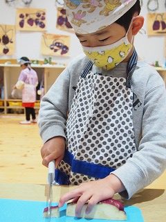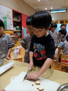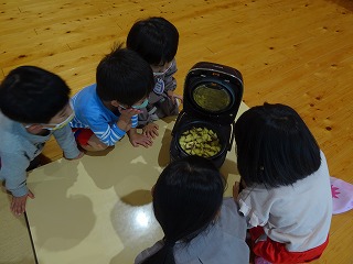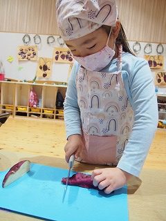 この日のお昼ご飯は、朝からゆり組ばら組が作った、サツマイモおにぎりとサツマイモお味噌汁でした。