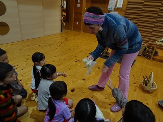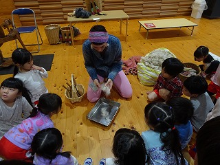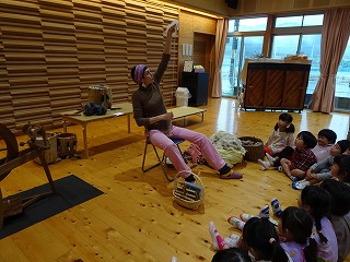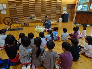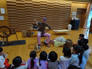 10月31日に豆の木訪問を予定していましたが、あいにくの雨・・・。遊びに行くことは出来ませんでしたが、当初予定していた羊毛紡ぎを園で実演してくださるということで、こども園に来ていただきました。