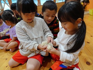 みんなが何気なく目にしたり触れたりする毛糸ってどうやって出来ているのかな?そして何に使われているのかな?というところからお話いただき、その後実際に羊毛に触れてみました。
