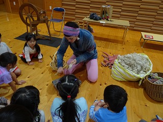 実際に触れて羊毛の感触を味わった子ども達。これがどうやって毛糸になるのか、とても興味をしめしていたよ。