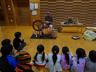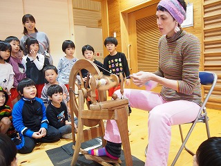 まずは、"ガーター”と呼ばれるもので羊毛をほぐし、不要な物を取り除きます。その後、"スピンドル”を用いて羊毛を紡いでいきます。これは手仕事になるので、もう少し簡単に羊毛紡ぎが出来るようにされたものが、"糸車”です。子ども達は羊毛がどんどん紡がれていく様子をとても真剣に見ていました。